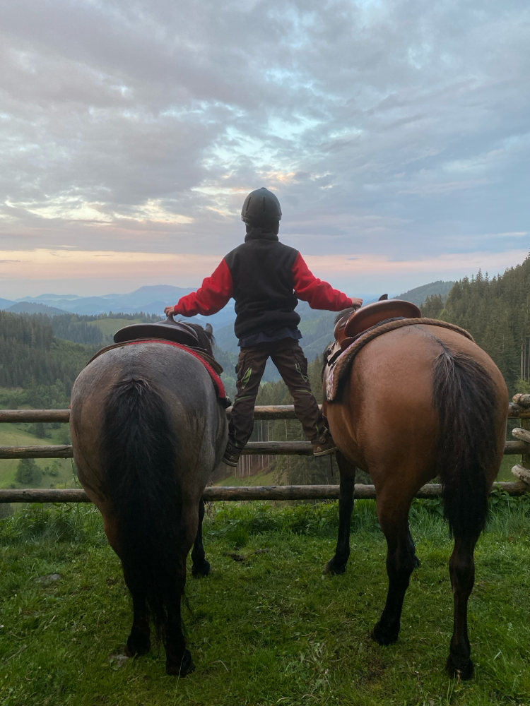 Unsere Huzulenpferde werden regelmäßig geritten, lernen auch mal längere Zeit angebunden zu werden und zu warten. Umgang mit Kindern und lauten Geräuschen ist ihnen ebenso bekannt, wie sie auch andere Tierarten kennenlernen. Über Stock und Stein geht es zu einem unserer Ziele, somit wird Geländetauglichkeit garantiert.